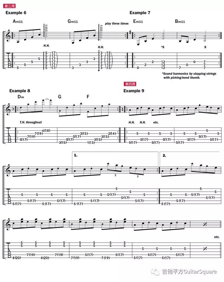虽然听起来有些不可思议,但其实你可以同人工泛音来扫出整个和弦。这也是本周练习的重点。在弹奏谱例6 时,以Am11-Gm11 和弦进行为基础,首先用食指停在第五品上所有六根弦。根据上周所学的内容弹奏前四个音符,用拨弦手的实质来制造12 品高位的人工泛音,然后用拇指来拨弦。然后难的地方就来了,从6 弦到1 弦一个连续向下的动作,用食指按出泛音同时用拇指拨弦。