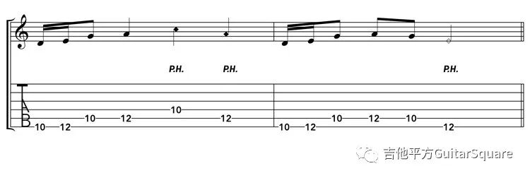 拨片泛音最常见于失真电吉他以及ZZ Top’s Billy Gibbons等人的演奏中,不过也可以用在原声吉他上来营造意想不到的效果。弹奏拨片泛音时,使用拨片搭配拇指上的一点指肉来进行拨弦,制造出类似尖叫的声音。在此处的曲谱中,一段A小调五声音阶(A C D E G)即兴反复段落就用了拨片泛音做点缀。